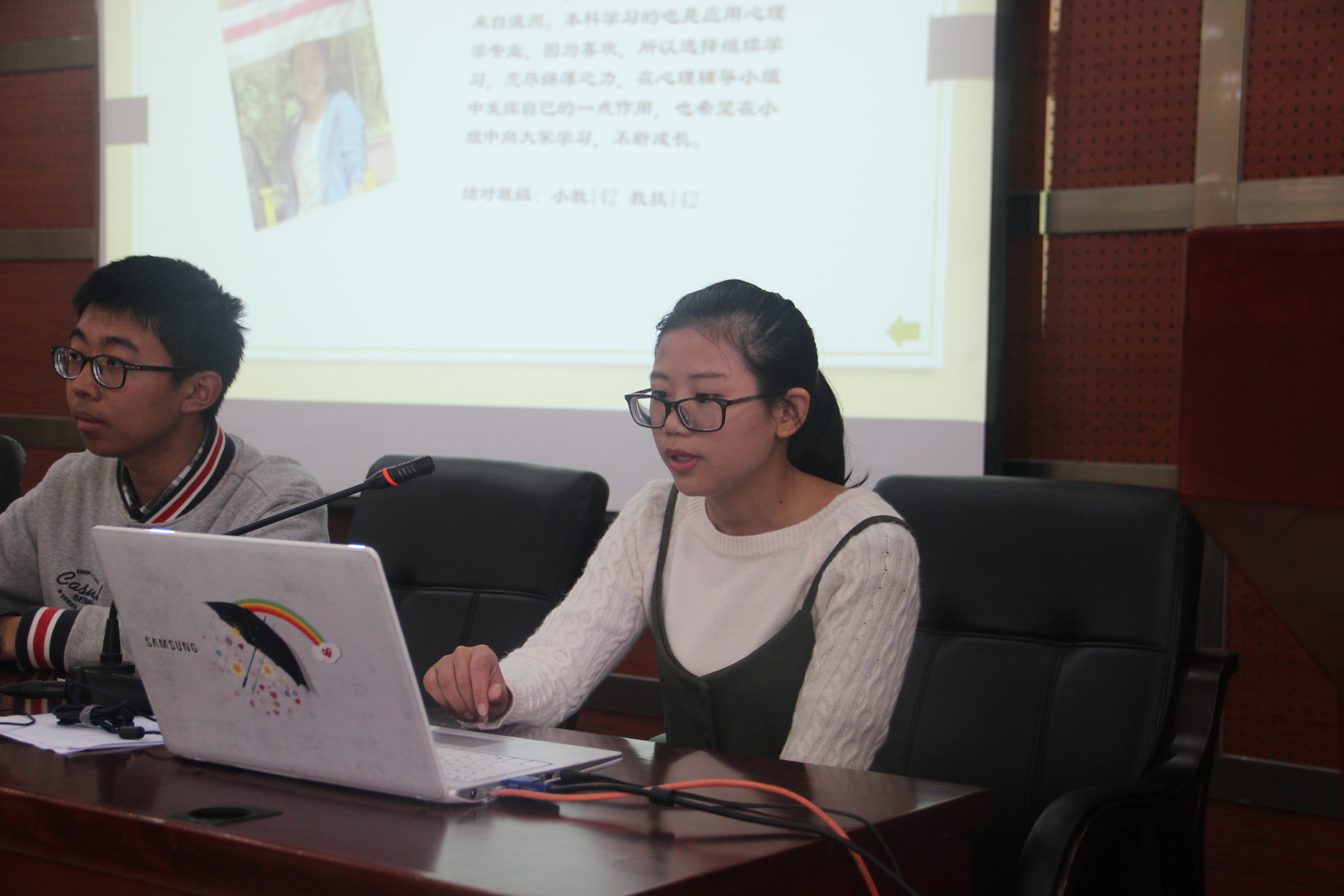 我院心理部副部长毛楚仪为在座的心理委员,心灵小护士介绍辅导小组的相关职责,展示去年的活动图片以及介绍了即将举办的“户外大作战”活动,并对晴雨表机制进行补充。随后, 16级“献颜小组”、15级“绘心小组”和14级“遇见更好的自己小组”分别上台介绍了自己的心理辅导小组组名及各成员,同时明确了对接班级。