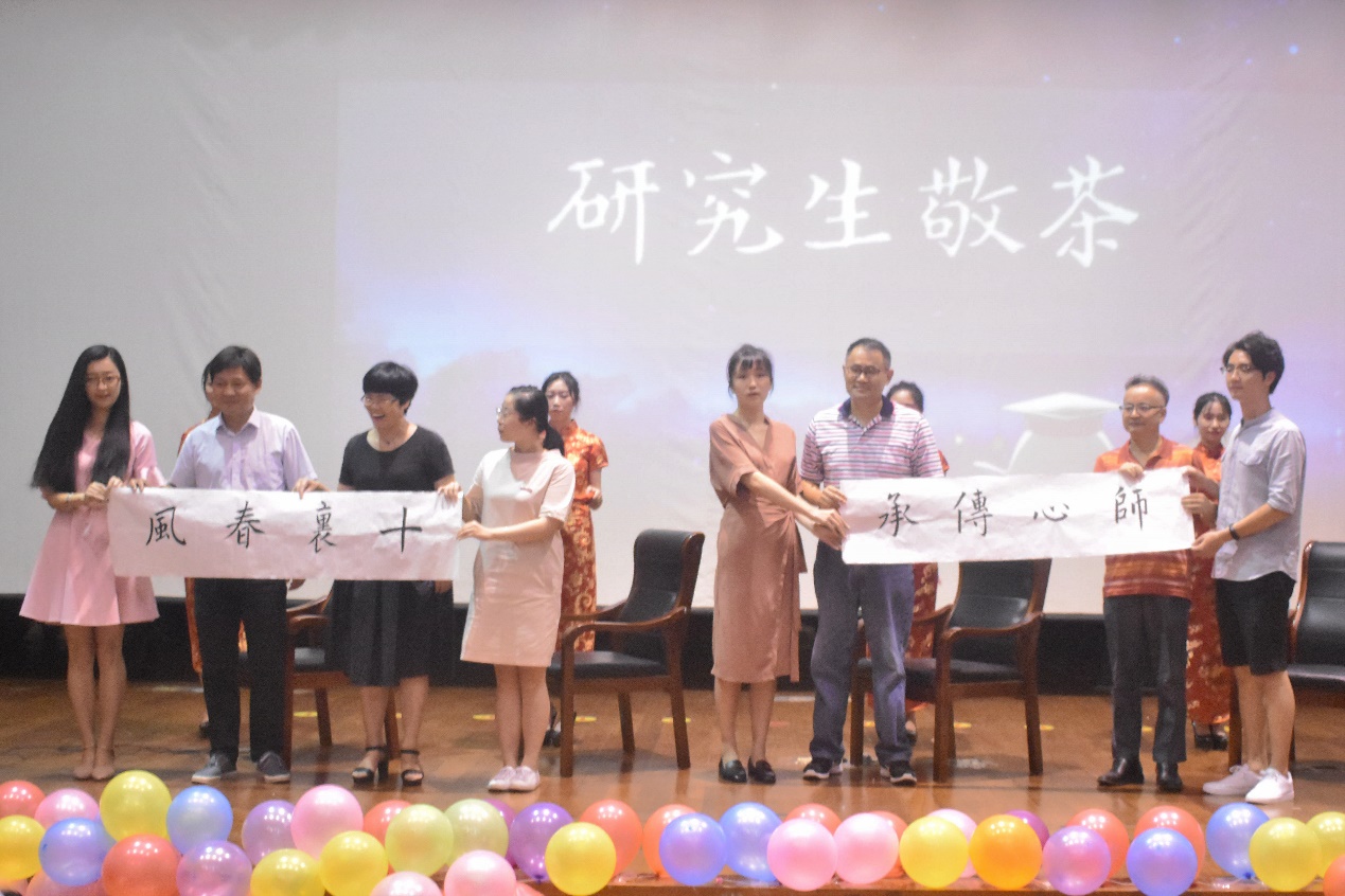 在新生班主任寄语环节中,小教183班班主任白改平老师结合数学典例,借用古希腊中象征完美的数字“7”,祝愿学生们拥有同样完美的大学生活。而在传统节目“研究生拜师仪式”中,四位研究生代表在三鞠躬后为导师献上香茶,导师回赠“十里春风,师心传承”字幅,师生合影,其乐融融。