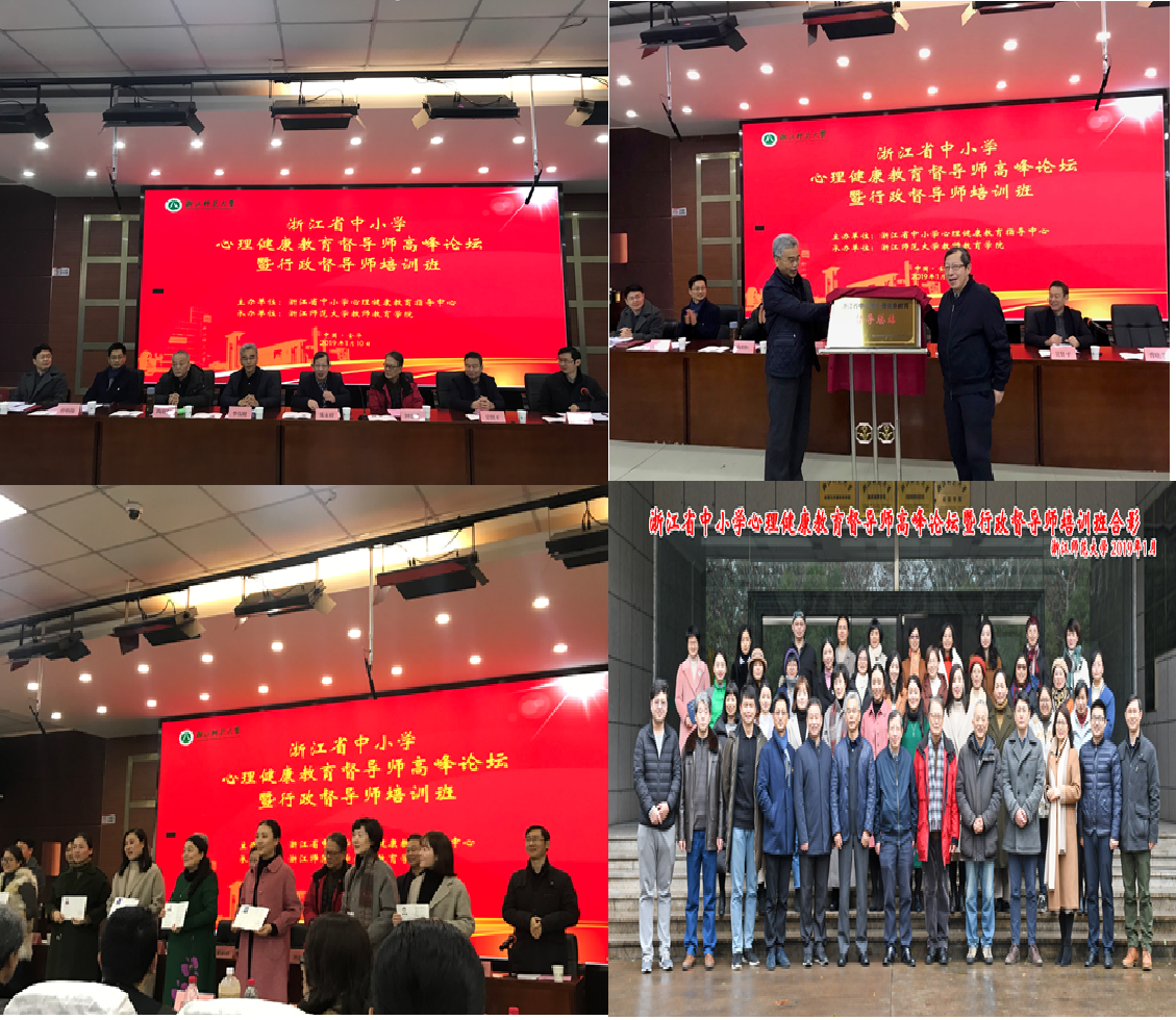 2019年1月10日,浙江省中小学心理健康教育督导师高峰论坛暨行政督导师培训班在浙江师范大学教师教育学院17幢112会议室顺利举行。浙江师范大学副校长李伟健教授、浙江省教育科学研究院院长朱永祥教授、南京晓庄学院陶勑恒教授、浙江师范大学钟思嘉教授、浙江省教育科学研究院副书记吴贤平、浙江师范大学研究生院常务副院长孙炳海教授、浙江省心理健康指导中心办公室主任庞红卫博士、浙江师范大学教师教育学院副院长曹晓华教授等出席了此次论坛。
