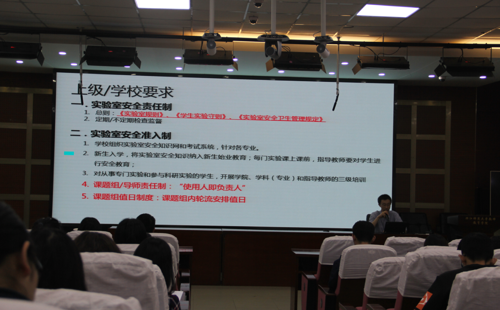 为落实学校关于实验室安全工作的文件要求,进一步加强教师和学生的实验室安全意识,我系于5月7日晚在17幢112报告厅举行心理学实验室安全教育讲座活动。会议由心理系主任李新宇老师主持,杨越老师做介绍,心理系部分教师和全体研究生参加了活动。