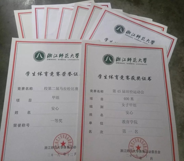 因为热爱运动,安心在运动方面获得了不少荣誉,马拉松、篮球、中长跑等各项运动均有涉足。曾获校运动会女子甲组4*100米第一名、100米第二名、200米第二名,斩获女子甲组400米的金牌以及400米跨栏的金牌。