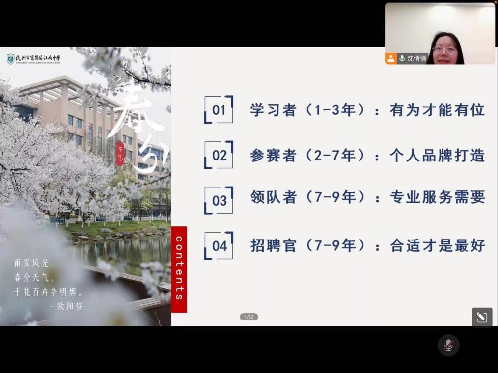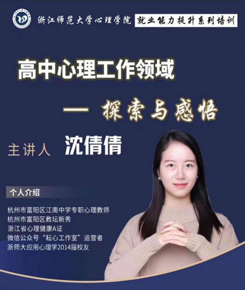 2023322日晚,永利23411“就业能力系列培训”讲座第一讲开讲。本次讲座邀请杭州市富阳区江南中学专职心理教师、杭州市富阳区教坛新秀、我院应用心理学2014届校友沈倩倩老师,为我们带来“高中心理工作领域-探索与感悟”主题讲座。