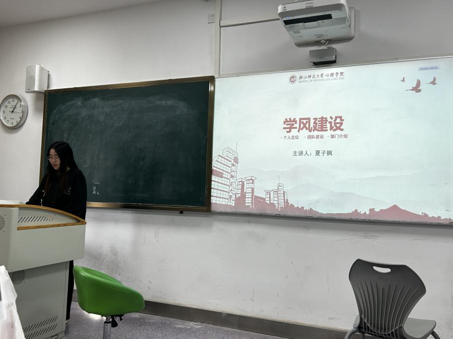 会议第一部分,夏子枫以“学风建设”为主题,强调作为学生干部,要有明确的个人定位以及拥有正确的团队认知,夏子枫提出“个人分工+团队合作才能最终实现共同目标”。最后,主讲人介绍了各部门的职能,以期增强各部门成员之间的相互了解,提高工作效率。