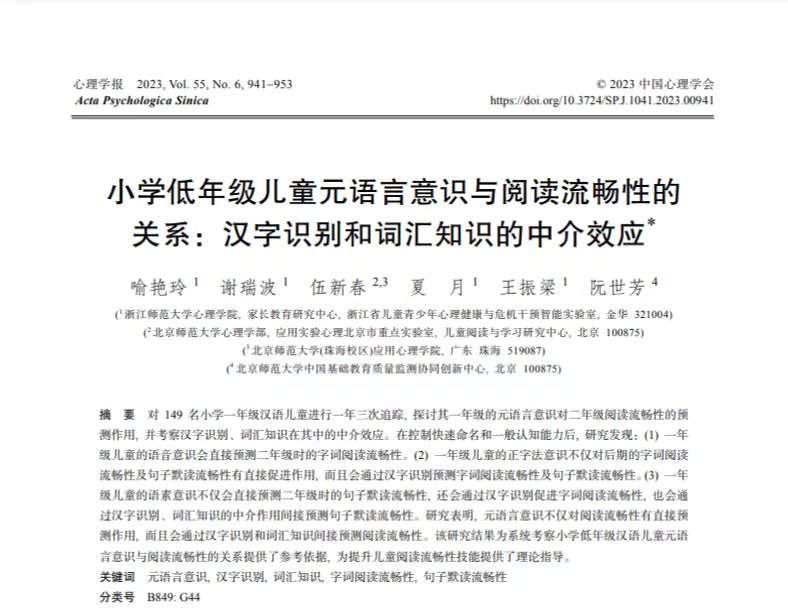 论文1来源:喻艳玲, 谢瑞波*, 伍新春, 夏月, 王振梁, 阮世芳. (2023). 小学低年级儿童元语言意识与阅读流畅性的关系: 汉字识别和词汇知识的中介效应. 心理学报, 55(6), 941-953.