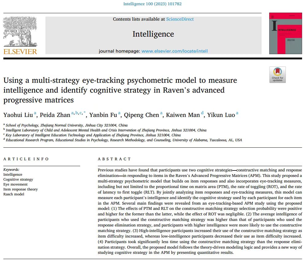 论文来源:Liu, Y., Zhan, P., Fu, Y., Chen, Q., Man, K., & Luo, Y. (2023) Using a multi-strategy eye-tracking psychometric model to measure intelligence and identify cognitive strategy in Raven’s advanced progressive matrices. Intelligence.