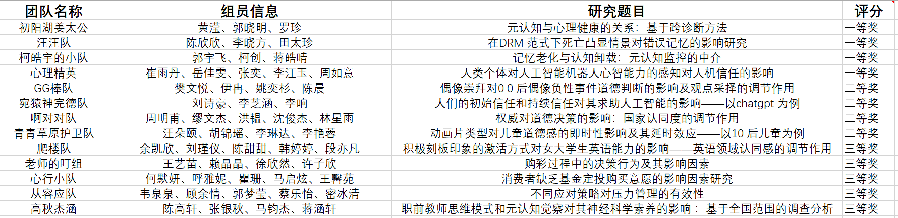 根据《关于举办2023年首届全国大学生心理与行为在线实验精英赛的第二轮通知》文件的相关要求,截止到8月19日20:00,共收到参赛作品13项。经个人申报,专家评审,最终评出一等奖4项,二等奖4项,三等奖5项。具体名单公示如下: