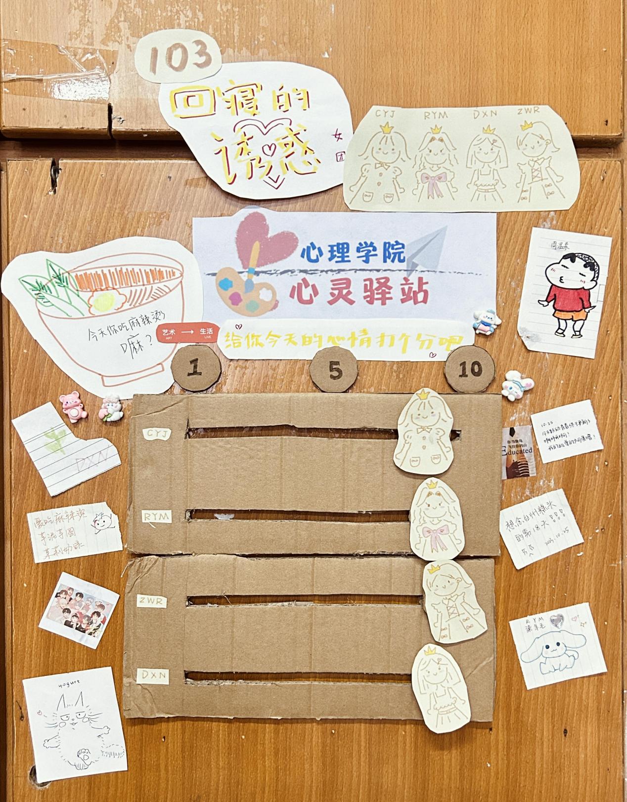 桃源6-301寝室的代表物是一只拿剑拿枪的英勇小狗,并且她们的心灵驿站由不同样子的元气小狗组成,每个人都有自己的专属代表物,每晚回寝后,大家都会在自己的心情记录上用移动小机关的方式总结今天的心情状态。
