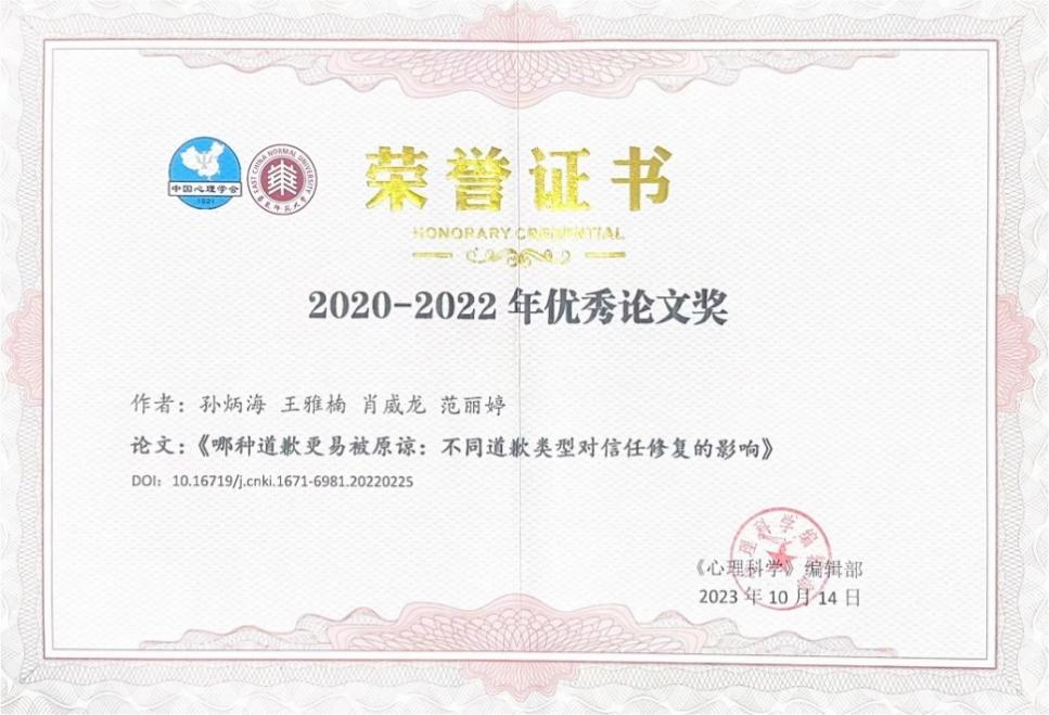 近期,永利23411集团博士研究生范丽婷撰写的论文《哪种道歉更易被原谅:不同道歉类型对信任修复的影响》获得《心理科学》2020-2022年度优秀论文奖。《心理科学》主编周晓林教授在10月14日举行的第二十五届全国心理学学术会议开幕式上宣读了获奖名单(共5篇)并进行颁奖。该研究得到国家社会科学基金重大项目《社会心理视角下新时代社会信任体系建设研究》(18ZDA165)的资助,是该重大项目的阶段性研究成果。