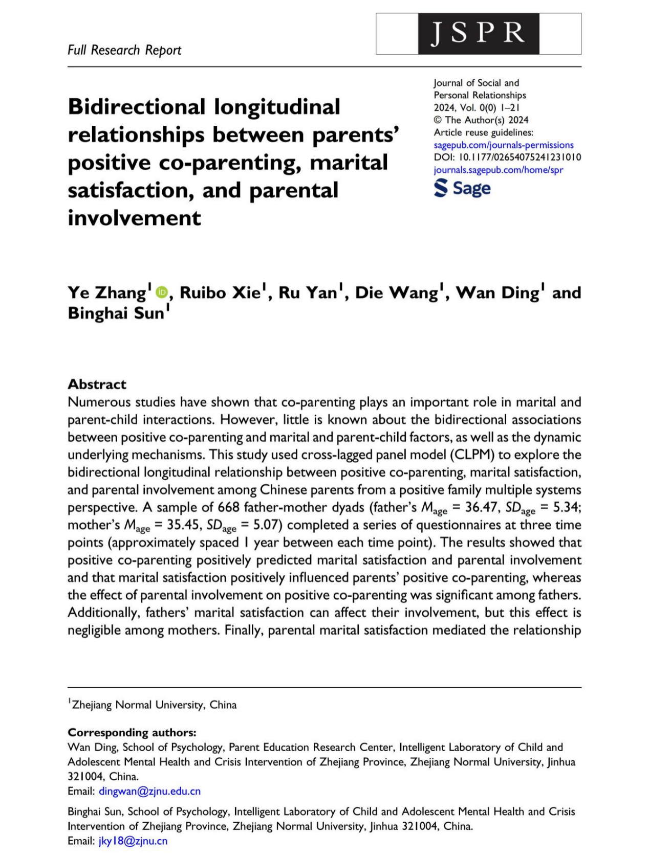 近期,永利23411集团丁菀副教授和孙炳海教授团队在国际期刊Journal of Social and Personal Relationships (JCR Q2; IF = 2.8)在线发表了题为Bidirectional longitudinal relationships between parents’ positive co-parenting, marital satisfaction, and parental involvement的学术论文。本研究以积极家庭多元系统视角为切入点,聚焦于父母、夫妻和亲子等多种角色之间的积极、动态的互动性质,揭示了积极协同教养、婚姻满意度和教养投入之间的双向关系与潜在机制。我院2022级硕士研究生张烨为第一作者,丁菀副教授、孙炳海教授为本文的通讯作者。该研究得到了国家社会科学基金重点项目(23FJKA003)的资助。论文来源:Zhang, Y., Xie, R., Yan, R., Wang, D., Ding, W.*, & Sun, B.* (2024). Bidirectional longitudinal relationships between parents’ positive co-parenting, marital satisfaction, and parental involvement. Journal of Social and Personal Relationships, 02654075241231010.文章链接:https://doi.org/10.1177/02654075241231010