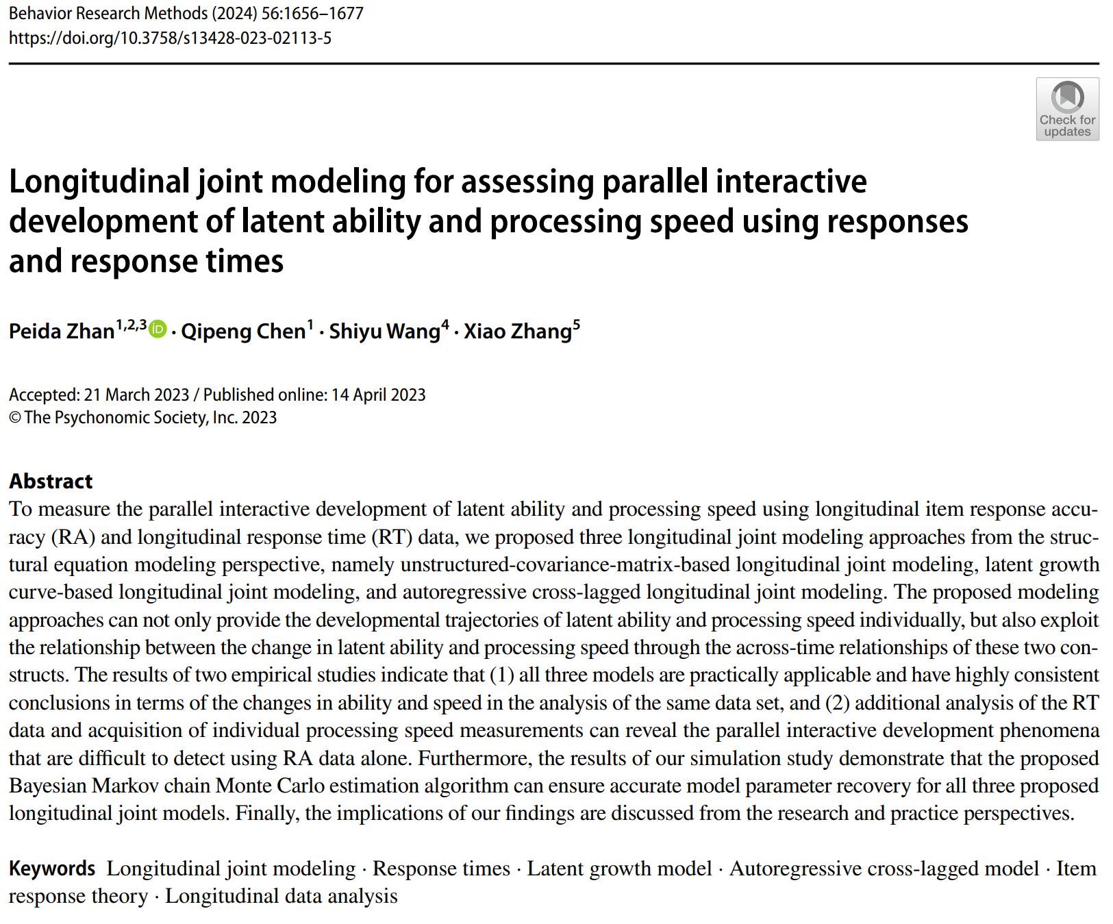 近期,永利23411集团詹沛达课题组在行为研究方法顶刊Behavior Research Methods (JCR Q1; 中科院[心理学: 数学]1区; 5-IF = 7.7)发表了题为Longitudinal joint modeling for assessing parallel interactive development of latent ability and processing speed using responses and response times的学术论文。詹沛达副教授为论文第一作者和通讯作者,我院2020级硕士研究生陈琦鹏为论文第二作者,其他合作者包括佐治亚大学的Wang, Shiyu教授和香港大学的Zhang, Xiao教授。该研究得到了国家自然科学基金(31900795)的资助。