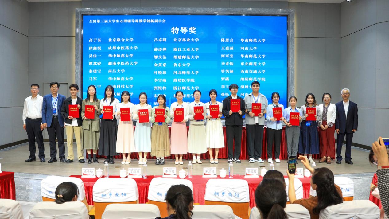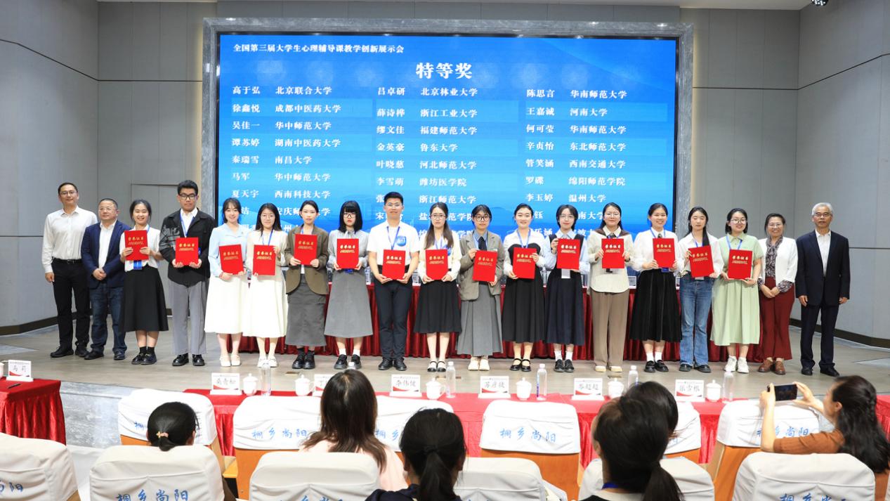 26日下午,中国第三届大学生心理辅导课教学创新展示会闭幕式暨颁奖典礼在上海尚阳外国语学校桐乡实验学校报告厅举行。