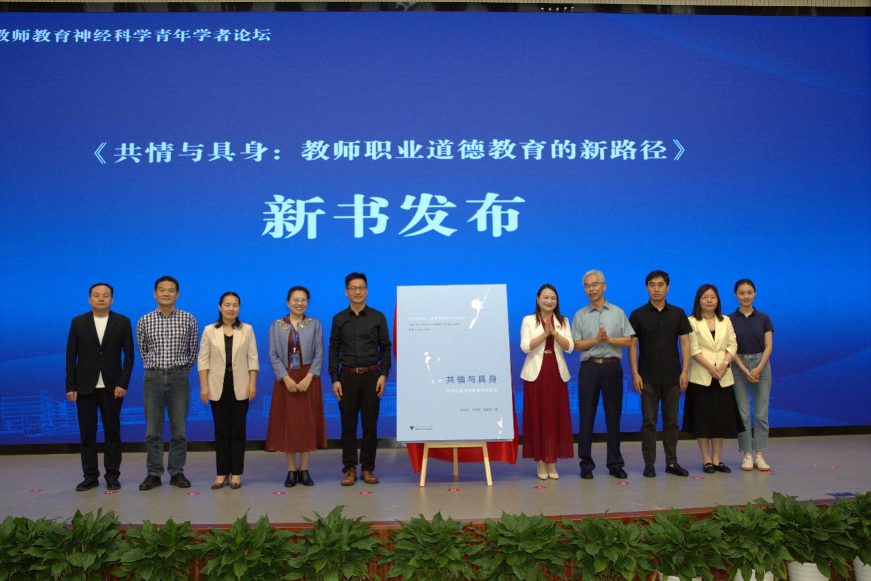 浙江师范大学田家炳德育研究中心德育神经科学实验室、浙江大学出版社举行《共情与具身:教师职业道德教育的新路径》新书发布会。浙江大学出版社党委委员、副总经理张琛致辞,并和新书作者孙炳海为新书揭幕,苏彦捷、吕迎春、李伟健、周跃良、温建明和李海良以及虞夏骏和范丽婷见证发布。