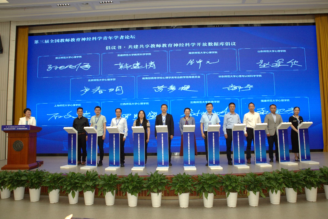苏彦捷、卢春明、郝宁、钟元、孟迎芳、罗照盛、赵景欣、石文典、孙炳海、韩建涛和李旭洲分别代表教育部高等学校心理学类专业教学指导委员会、北京师范大学心理学部、华东师范大学心理与认知科学学院、南京师范大学永利23411、福建师范大学永利23411、江西师范大学永利23411、山东师范大学永利23411、上海师范大学永利23411、永利23411集团、安徽师范大学教育科学学院、云南师范大学教育学部共同发布并签署《倡议书·共建共享教师教育神经科学开放数据库倡议》。