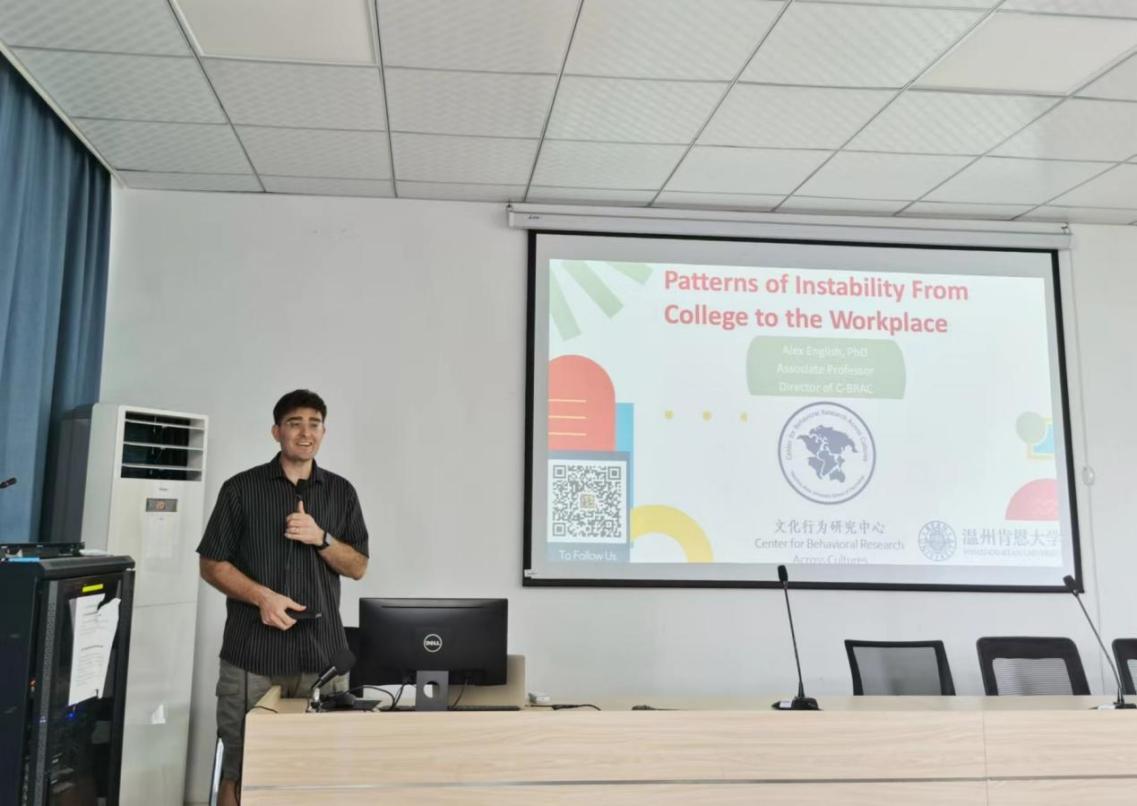 随后开始的“尖峰卓越心理讲堂第八十五讲”,邀请到了温州肯恩大学永利23411副教授Alexander S. English,为我院师生作题为《From College to the Workplace:An In-depth Understanding of the Trajectories in Emerging Adulthood for China’s Youth》的精彩讲座,讲座由永利23411孙茜老师主持。