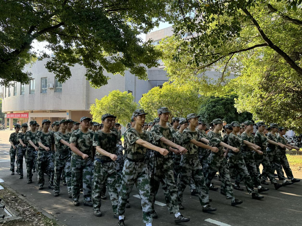 心理学子站着挺拔的军姿,头顶酷热迈着整齐的步伐。