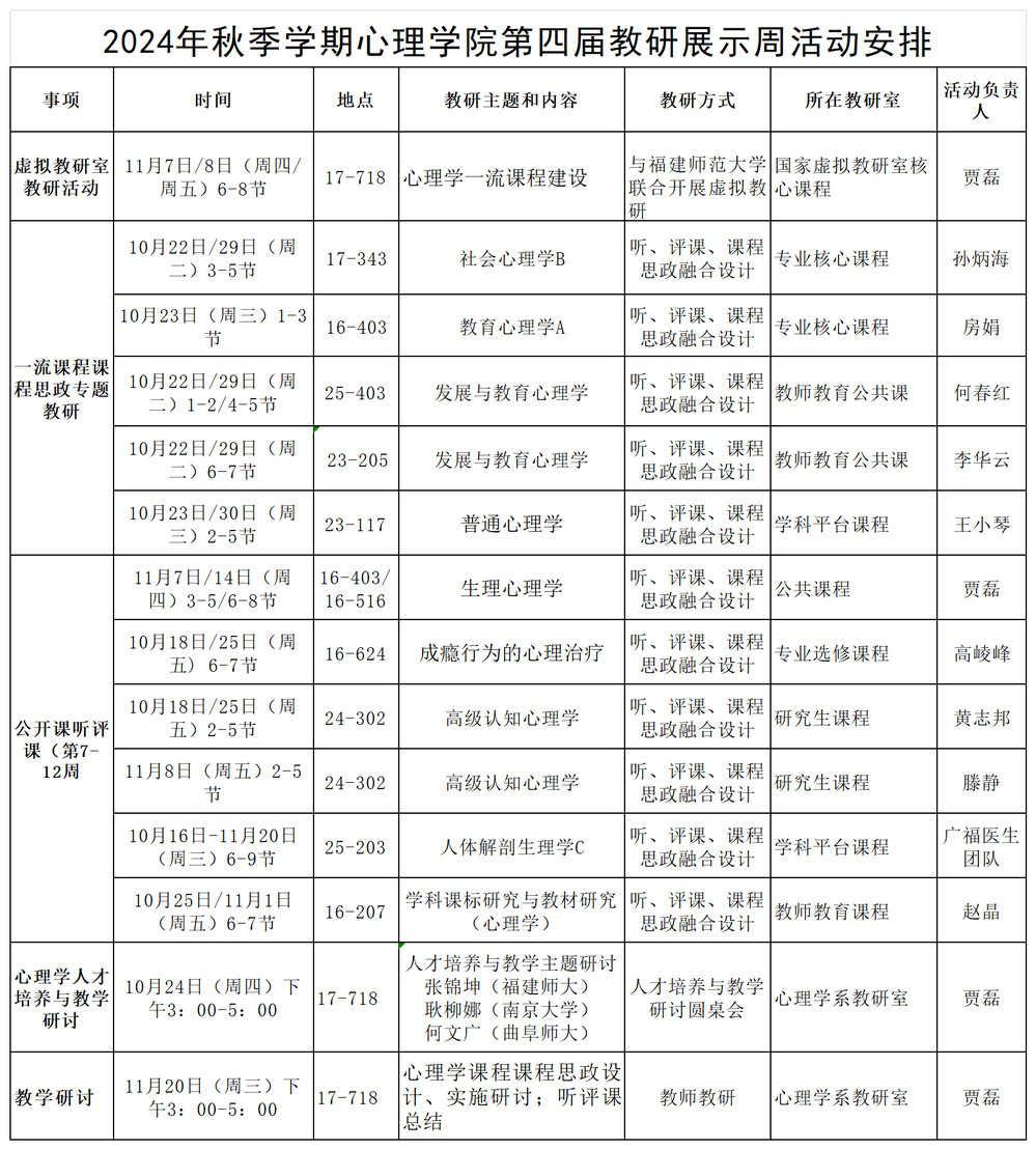 各位老师: 为了进一步提升教育教学质量,共同营造良好的教研氛围,推动心理学课程思政建设,促进教师专业成长,学院将于10月16日至11月22日举办第四届教研展示周活动。具体安排如下:以上活动如有调整,将提前通知时间地点。