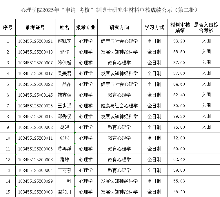永利234112025年“申请-考核”制博士研究生材料审核成绩公示(心理学学术学位博士 第二批)