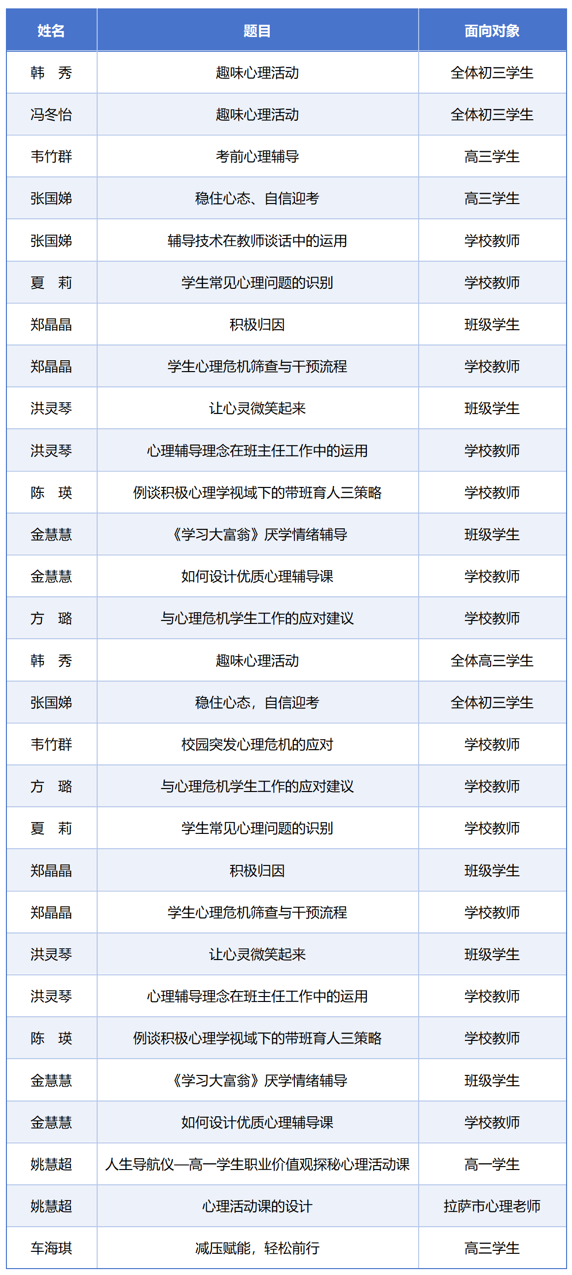 此次支教活动中,浙派名师化身心灵引航者,为边疆师生带来一场场精彩纷呈的心育盛宴。他们面向小学到高中的莘莘学子,精心设计并开展 13 堂心理课程,从趣味十足的情绪管理小课堂,到干货满满的高考减压指南,层层递进呵护学生心灵成长;同时,针对班主任、学科教师与心理教师群体,举办 13 场深度心理讲座,分享前沿心育理念与实用技巧。从课堂教学到专题分享,活动形式多元创新,为边疆地区构建起全方位、多层次的心育新样态,为师生心理健康发展注入蓬勃生机。