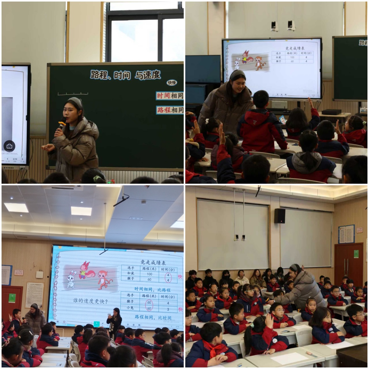 本次见习的核心环节是观摩南苑小学楼丽云老师执教的数学课《路程、时间与速度》,通过课程观摩,学习讨论皮亚杰的认知发展理论与建构主义学习理论在课堂中的应用。作为浙江师范大学的优秀毕业生,楼老师凭借扎实的教学功底,打造了一堂趣味盎然且有深度的数学课。课堂伊始,楼老师以“动物竞走比赛”为趣味切入点,从学生熟悉的比赛场景出发,循序渐进地引出“路程”“时间”“速度”三个核心概念,将抽象难懂的数学公式转化为具象可感的认知内容。在知识应用环节,楼老师设计了一系列生活化问题,让学生在思考与解答中逐步掌握“速度=路程÷时间”的计算方法,充分调动了学生的主动学习积极性。